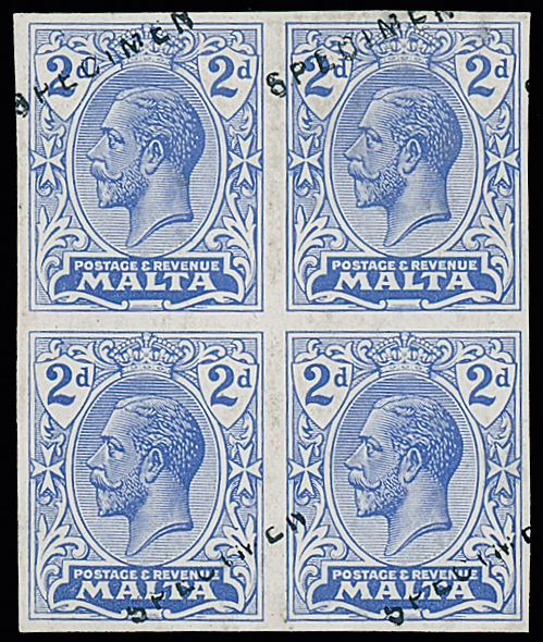 Malta: Issued Stamps: King George V: Key Plates, Proofs, 2d. imperforate colour trial in blue, block of four, each diagonally overprinted “SPECIMEN” (Samuel type DS1), on ungummed watermarked paper, fine. Photo. (Image1)