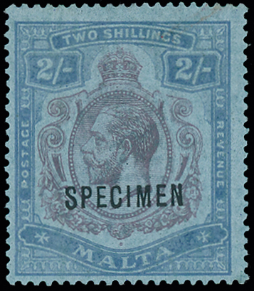 Malta: Issued Stamps: King George V: 1921-22 Watermark Mult. Script CA 2s. purple and blue on blue broken crown and scroll and also overprinted “SPECIMEN”, fine with gum, very rare. S.G. 103d, s. Photo. (Image1)
