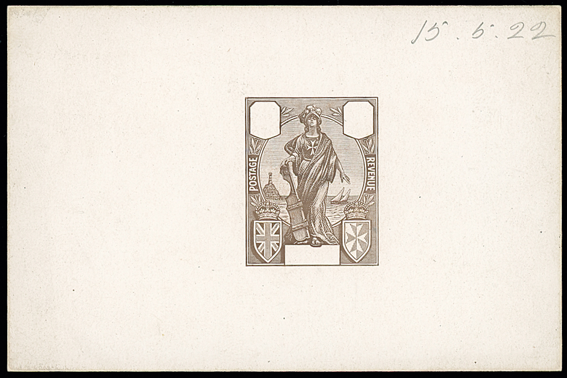 Malta: Issued Stamps: King George V: 1922-26 Melita, Proofs, Master die proof with blank country name and value tablets, used for the 1/4d. to 6d. and £1 values, printed in brown on glazed card (92 x 60mm), pencil
