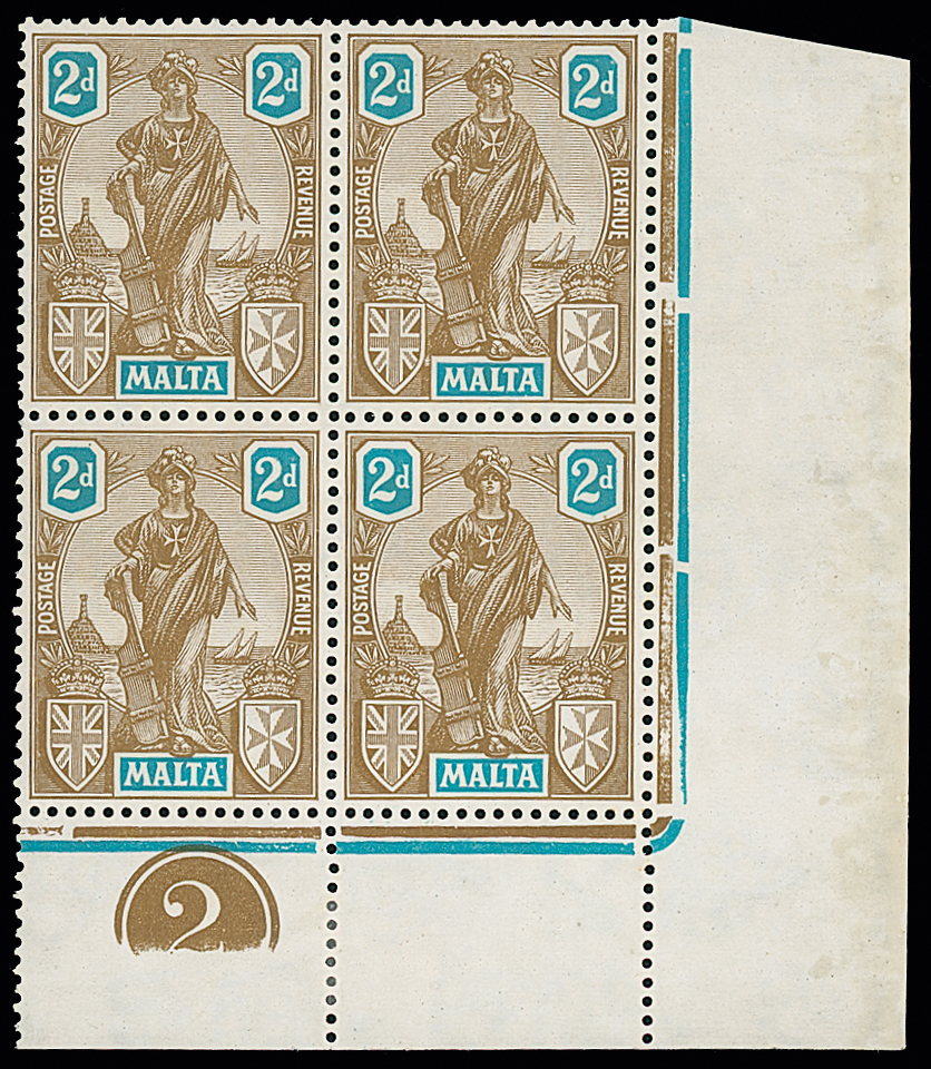 Malta: Issued Stamps: King George V: 1922-26 Melita, 2d. bistre-brown and turquoise in a fine unmounted mint block of four from the foot of the sheet with scarce plate number “2”. Nearly all stamps from plate 2