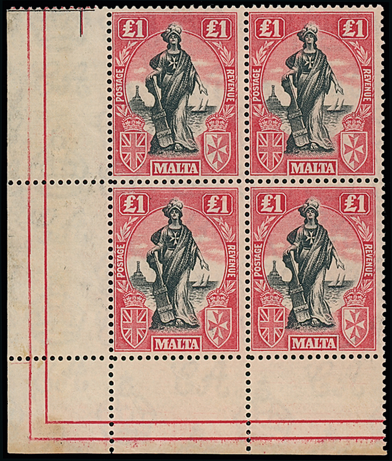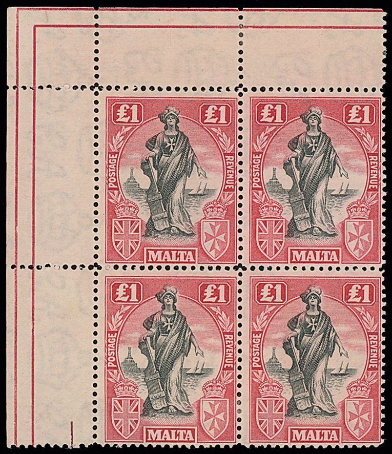 Malta: Issued Stamps: King George V: 1922-26 Melita, £1 black and bright carmine watermark upright in a fine unmounted mint block of four from the lower-left corner of the sheet. S.G. 140, cat. £480+. Photo. (Image1)