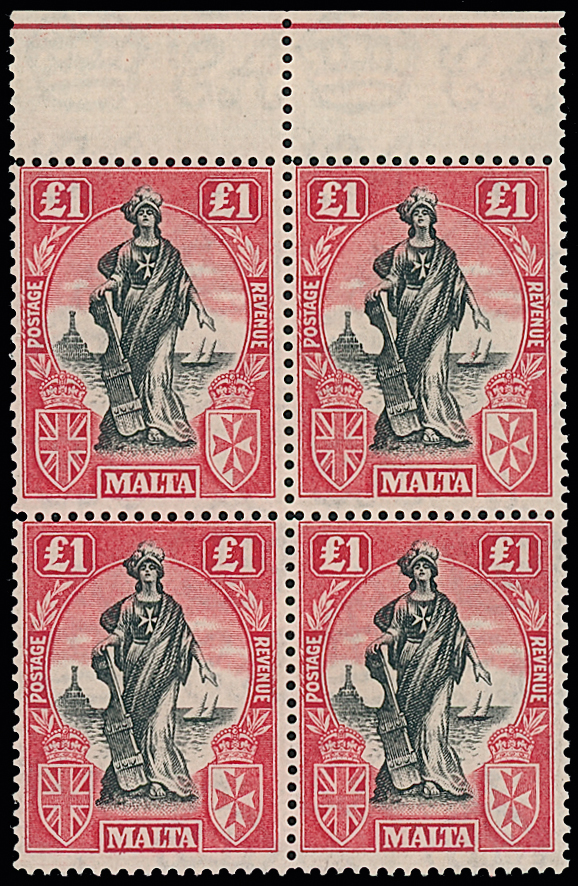 Malta: Issued Stamps: King George V: 1922-26 Melita, £1 black and bright carmine with watermark upright in a fine unmounted mint block of four from the top of the sheet. S.G. 140, cat. £480+. Photo. (Image1)