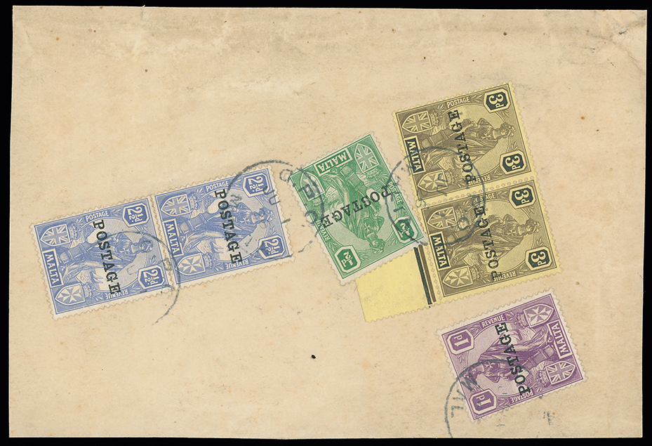 Malta: Issued Stamps: King George V: 1926 overprinted “POSTAGE”, 3d. black on yellow with variety overprint inverted a horizontal pair, used on large piece with normal 1/2d., 1d., 21/2d (2), fine and scarce