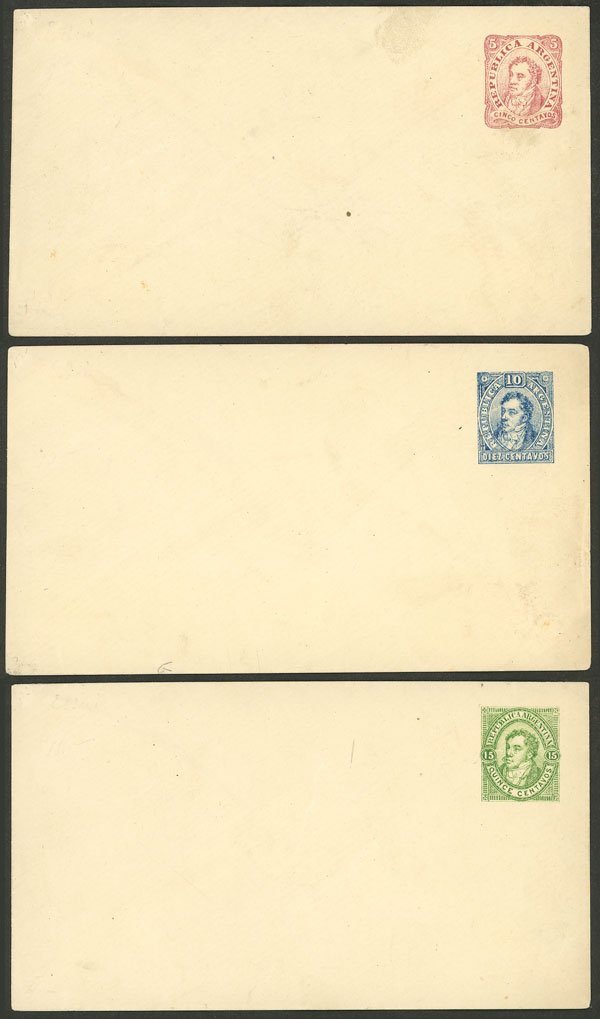 135   imageESSAYS of 3 envelopes (postal stationeries) with image of Rivadavia and values: 5c. (red), 10c. (blue) and 15c. (green) printed by R. Lange and not adopted, not catalogued, excellent quality and very rare! NOTE: Upon request of the buyer, it is sold with certificate of authenticity. (Image)