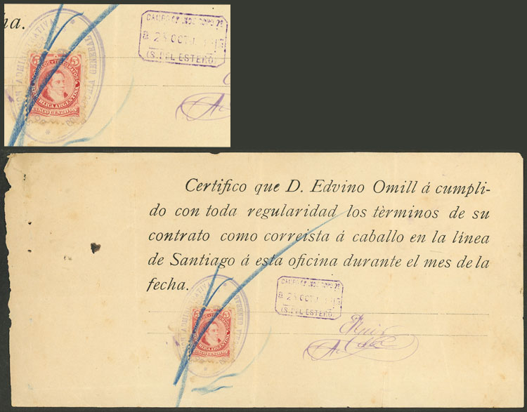 140   imageRARE POSTAL MARKING: Certificate for trips made by "post rider" by contractor Edvino Omill, from Santiago del Estero to Campo Grande Copo, in October 1889, franked with 5c. (GJ.105) and a very interesting violet rectangular datestamp of CAMPO GRANDE COPO! (Image)