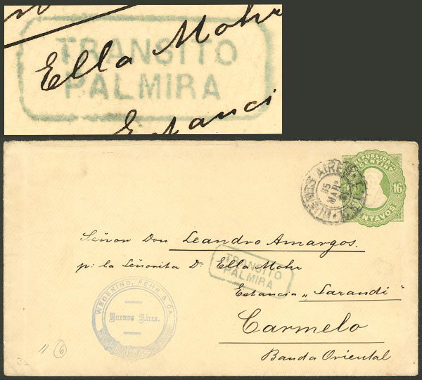 139   image16c. Stationery envelope (GJ.SOB-6) sent from Buenos Aires to Estancia Sarandí, Carmelo, Uruguay on 15/MAR/1883. On front there is an interesting Uruguayan mark "TRANSITO - PALMIRA", very fine quality, rare! (Image) (Image-02) (All Images)