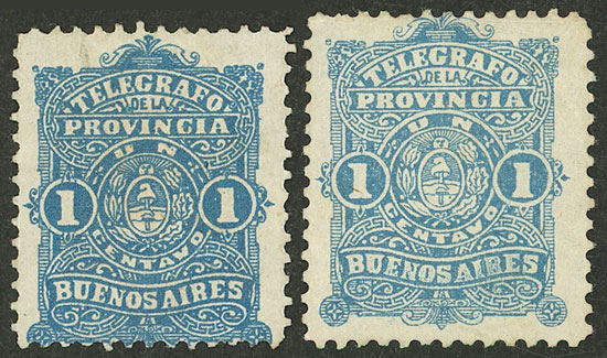 124 46 imageGJ.46, Telegraph of Buenos Aires, 1888 1c., 2 stamps in different shades: blue and pale blue, mint without gum, VF! (Image)
