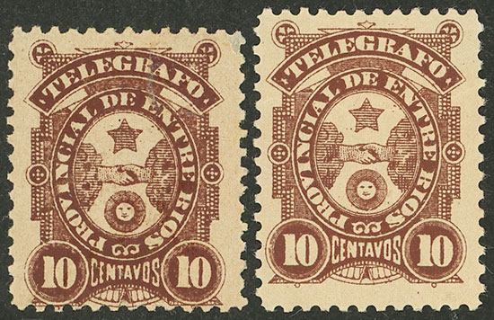 125 52 imageGJ.52, Telegraph of Entre Ríos 10c., 2 mint stamps, in chocolate and light chocolate, VF! (Image)