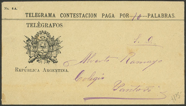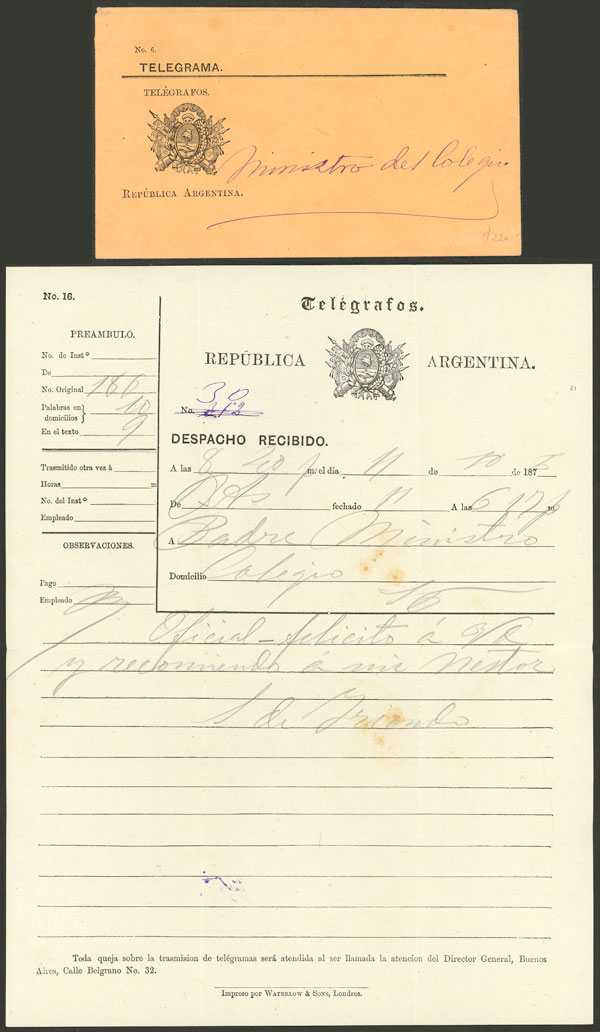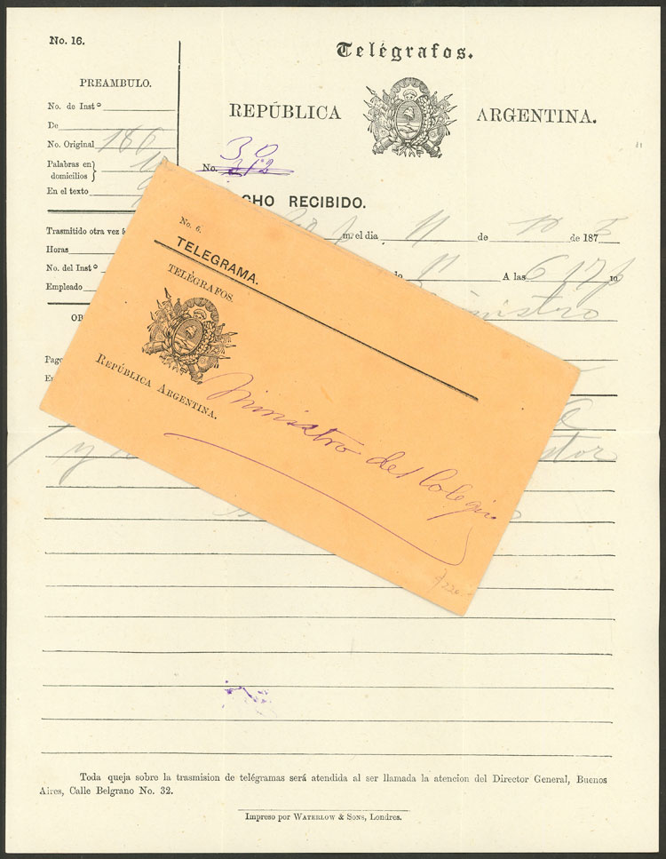 128   imageTelegram sent by the National Telegraph in Buenos Aires on 11/OC/1875, including the envelope in which it was delivered, VF quality, rare! Ex-Loeb (its price was US$220) (Image) (Image-02) (All Images)