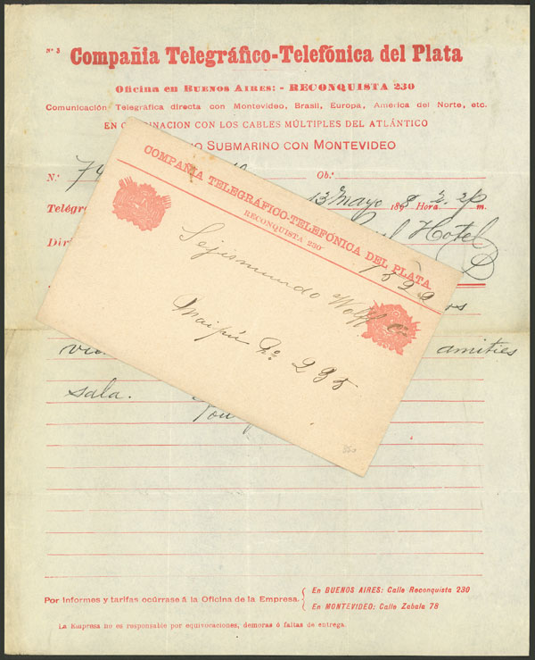 132   imageTelegram sent by Compañía Telegráfico-Telefónica del Plata, sent from Montevideo to B.Aires on 13/MAY/1898, including the envelope in which it was delivered, VF quality, rare! Ex-Loeb (its price was US$350) (Image) (Image-02) (All Images)