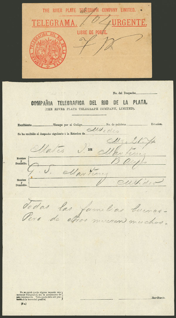 126   imageTelegram sent by Compañía Telegráfica del Río de la Plata, sent from Montevideo to B.Aires on 21/MAR/1867, including the envelope in which it was delivered, VF quality, rare! Ex-Loeb (its price was US$250) (Image) (Image-02) (All Images)