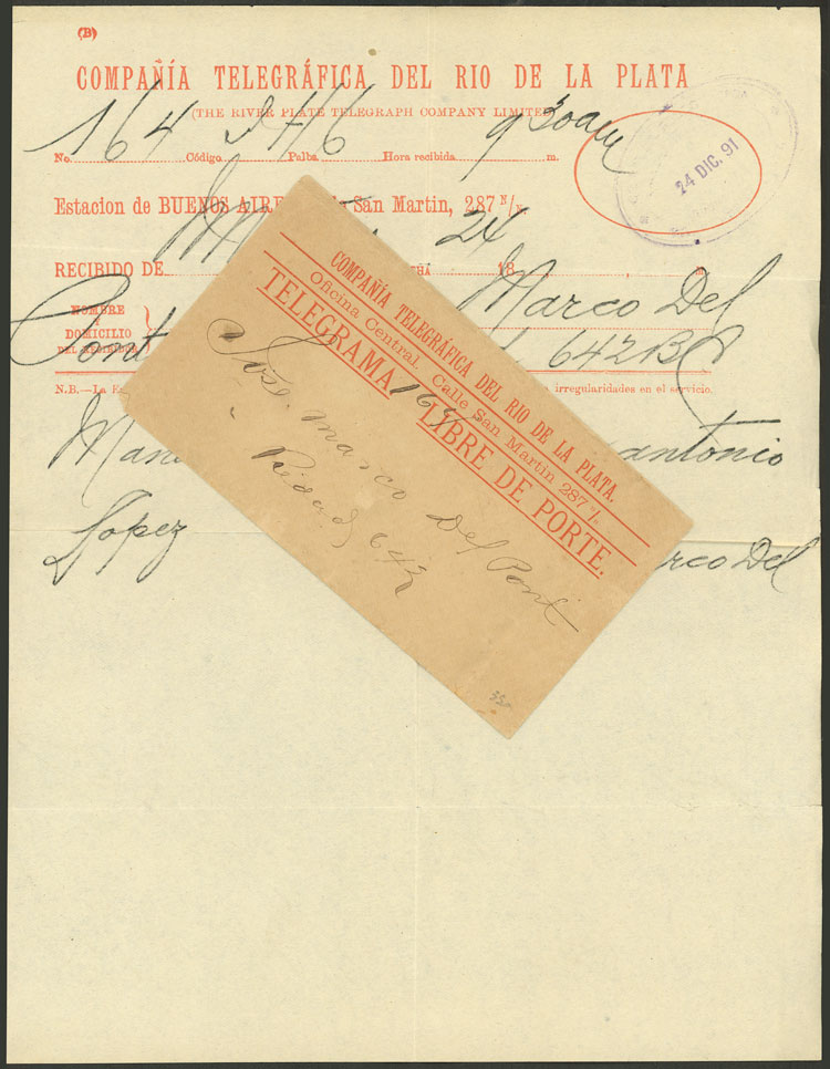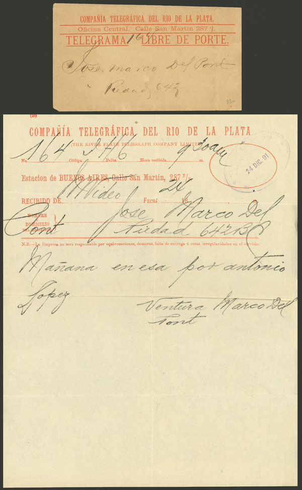 131   imageTelegram sent by Compañía Telegráfica del Río de la Plata, sent from Montevideo to B.Aires on 24/DE/1891, including the envelope in which it was delivered, VF quality, rare! Ex-Loeb (its price was US$350) (Image) (Image-02) (All Images)