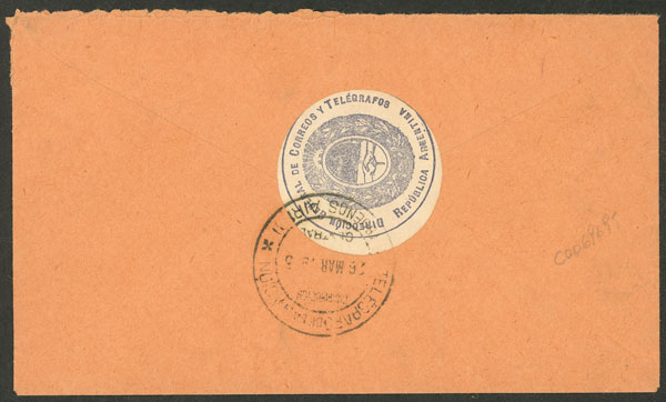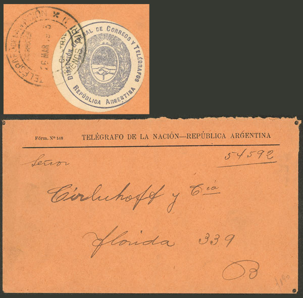 133   imageEnvelope of a telegram delivered in Buenos Aires on 26/MAR/1903, on back it has an attractive seal datestamped "TELÉGRAFO DE LA NACIÓN", excellent quality, ex-Loeb (its price was US$190) (Image) (Image-02) (All Images)