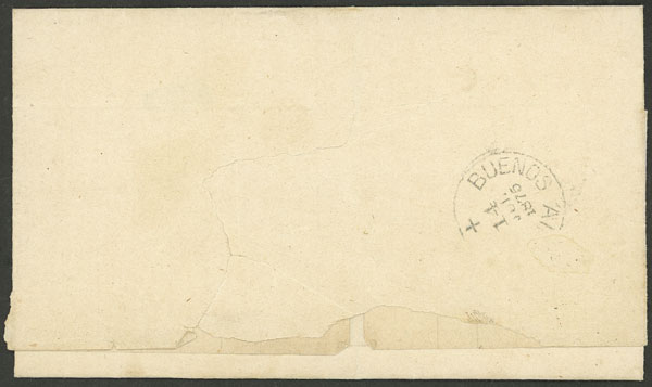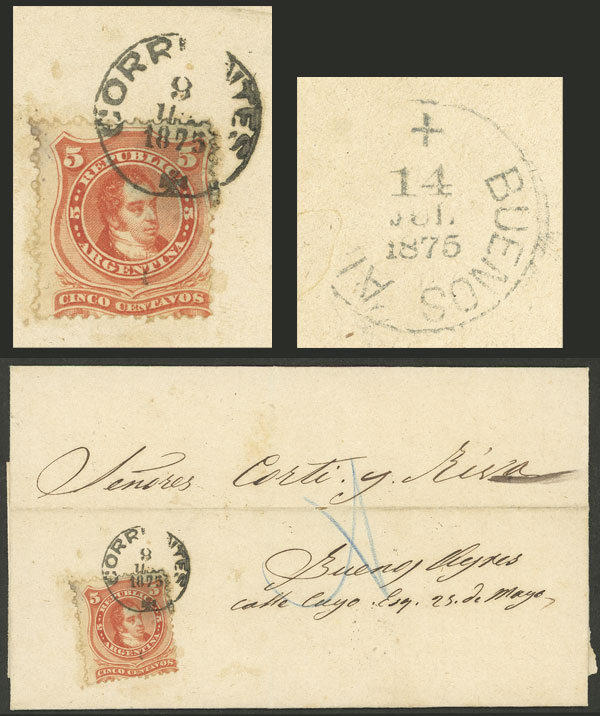 138   image9/JUL/1875 Corrientes to Buenos Aires, folded cover franked with 5c., datestamp of Corrientes with Maltese cross, on back arrival mark of Buenos Aires 14/JUL, VF quality! (Image) (Image-02) (All Images)