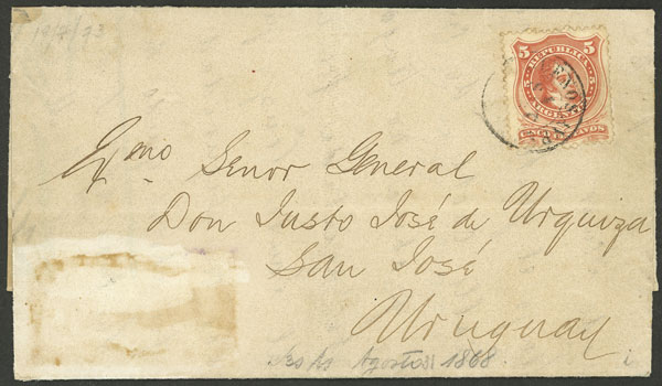 137   imageENTIRE LETTER TO GRAL. URQUIZA: Franked with 5c. and sent from Buenos Aires (sender Thomas Armstrong) on 31/AU/1868, he says that he enclosed a letter from Coronel Santa Cruz, "who entrusted me with ensuring it safely reaches your hands, Your Excellency", very interesting! (Image)