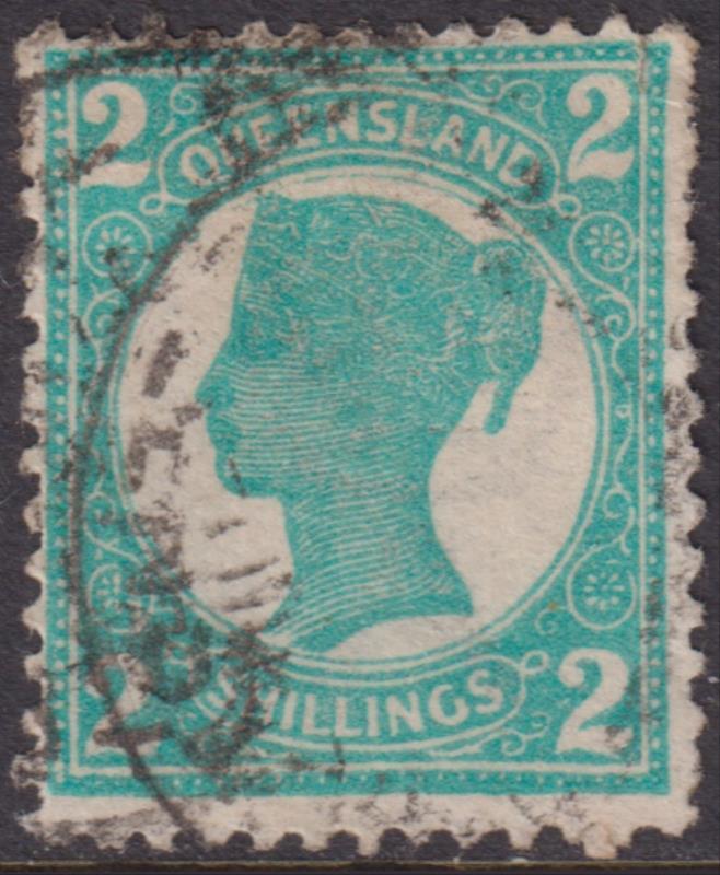 Queensland 1908 2/- QV turquoise, p12½, crown over A wmk, light cds. SG 300. Cat £50. FU.