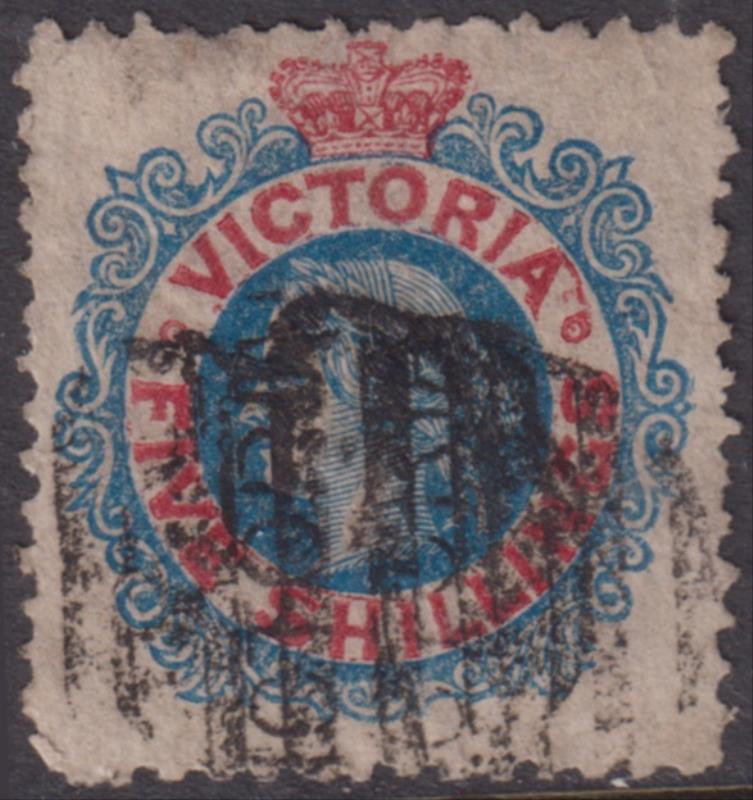 Victoria 1869 5/- QV (type I) blue & carmine. SG 140a. Cat £25. GU.