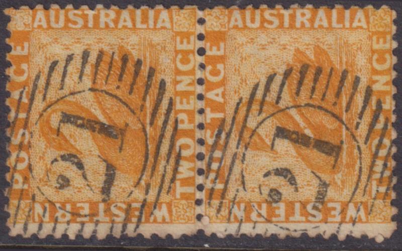 Western Australia 1864 2d Swan yellow vert pair, p12½, with crisp barred "21" cancels. Very neat & attractive. SG 55. Cat £17. FU.