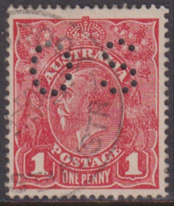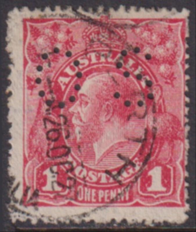 1914-21 1d GV carmine-red, die 2 with "OS" Official perfin, 2nd (wide) crown over A wmk. Quite w/c. SG 39h. Cat £80. FU.