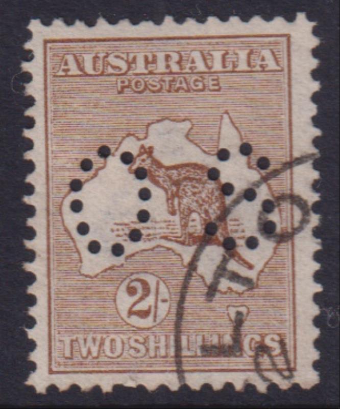 1914 2/- Roo brown, with small "o s" Official perfin, 1st crown over A wmk. O/c to left. Excellent perfs. SG O26. Cat £180. FU.