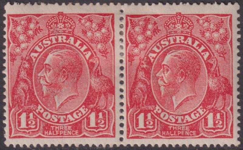 1925 1½d GV scarlet horiz pair incl "HALFPENCE" flaw. SG 77, 77b. Cat £33. Mint.