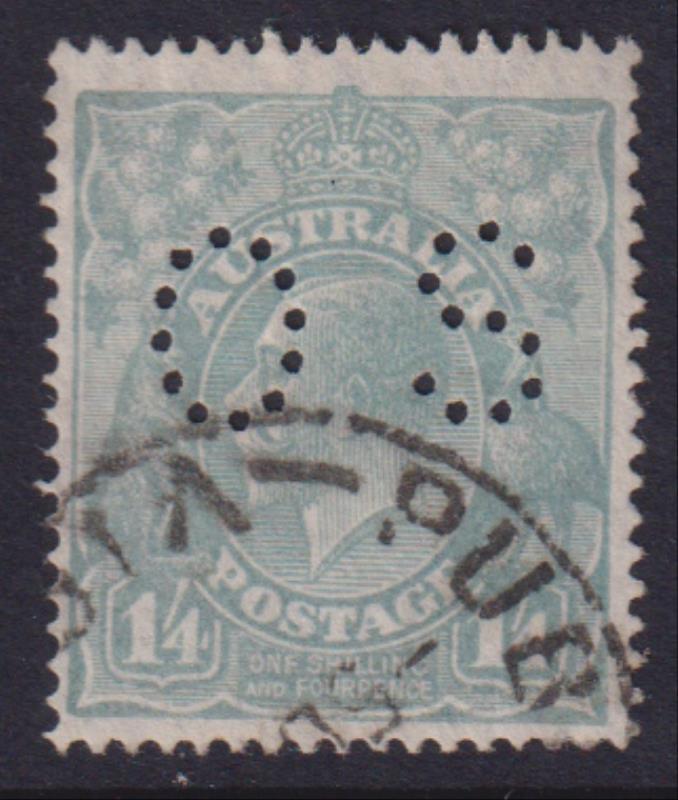 1926-30 1/4d GV pale greenish blue, "OS" Official perfin, wmk multiple crown & A, p14. Very scarce variety. SG O96. Cat £300. FU.
