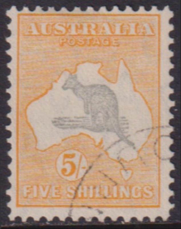 1932 5/- Roo grey & yellow, C of A wmk. SG 135, BW 46w. Cat A$60. FU, premium for CTO.