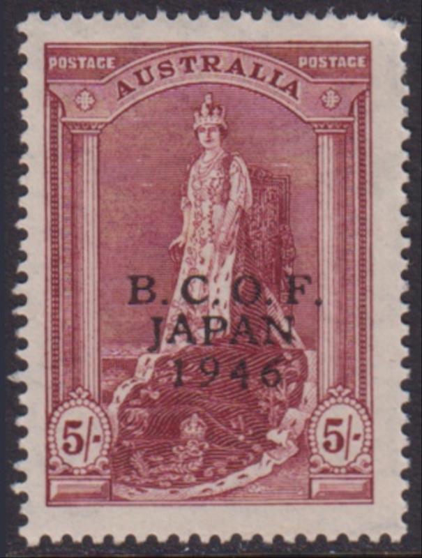 1946 5/- BCOF ovpt, small tone spot. SG J7a. Cat £130. Mint.