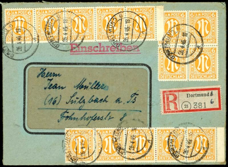 6 pfennigs first issue of stamps for Germany after WW II., 14 values as scarce properly franked multiple franking on registered cover from "DORTMUND 26.4.46" to Sulzbach, reverse on route passing cancellation from Frankfurt (Main) 5.5.46 (13(14)) 6 Pfennig AM-Post, 14 Werte als seltene portogerec