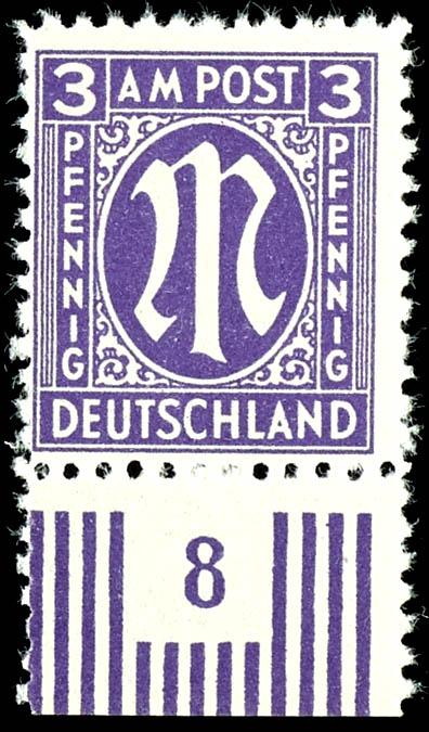 3 pfennigs first issue of stamps for Germany after WW II., German printing, dark bluish purple on z-paper, perfectly mint never hinged, unsigned, photo copy of a certificate Andreas Schlegel BPP (for former block of four) "the quality is perfect. ", Michel 500.- (17bDz) (page)