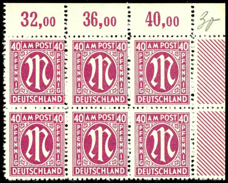 40 pfennigs first issue of stamps for Germany after WW II. German printing, red lilac, perforated L 11 : 11 1 / 2, paper z, counter sheet type 9, corner margin block of six top right (fields 8 / 9 / 10 and 18 / 19 / 20), field 10 in the margin of sheet without sheet counting number, mint never hinge