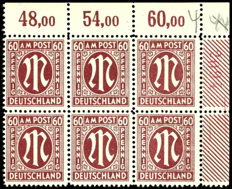 60 pfennigs first issue of stamps for Germany after WW II., German printing, dark carmine brown, perforation L 11, paper z, counter sheet type 2, corner margin block of six top right (field 8-10 / 18-20), besides field 10 red four place sheet counting number "2094", mint never hinged, very fine, pho