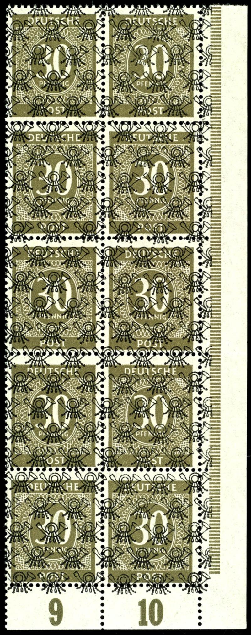 30 Pf. numeral dark brownish olive with net pattern overprint, part sheet of 10 values from of the right lower corner of the sheet with 4 sheet margin values and a lower margin pair, each expertized A. Schlegel BPP, Michel 900.- (63IIPb) 30 Pf. Ziffer dunkelbräunlicholiv mit Netzaufdruck, Bogente