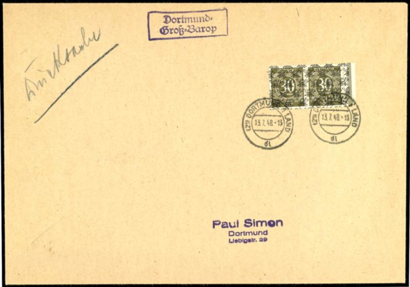 4 pfennigs first issue of stamps for Germany after WW II., close perforated, horizontal pair as properly franked multiple franking on printed matter from Essen 25.4.46 to Dortmund, cover a little shaded, expertized Hettler BPP. (11C(2)) 4 Pfennig AM-Post, eng gezähnt, waagerechtes Paar als portog