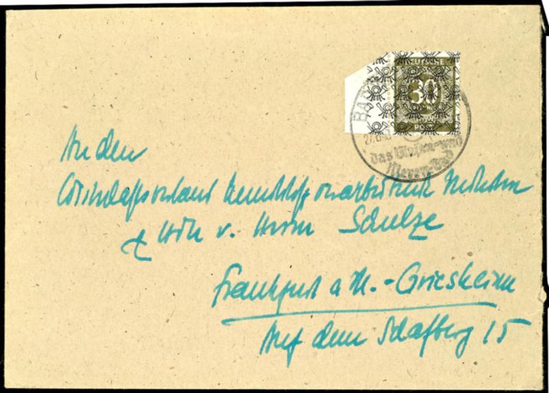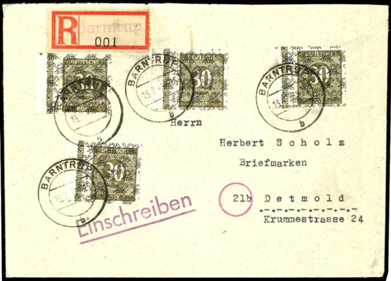 30 Pf. brownish olive with net pattern overprint, original stamp each from left margin in the rotary printing, 4 faultless values on postage exceeding tariff rate registered cover from 13.7.48 from BARNTRUP to Detmold, photo expertize study group (Bernhoeft) and expertized Schlegel BPP, by the Miche