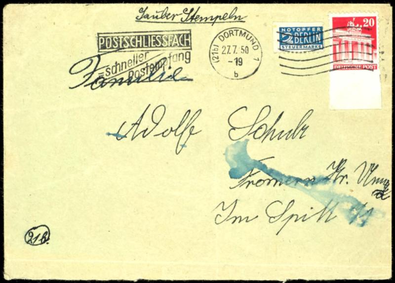 20 pfennigs buildings, variety "at the bottom imperforated", lower margin copy as properly franked single franking on commercial letter from Dortmund, stamp sound, letter transport traces / creased, expertized Novak BPP. (85Ues) 20 Pfennig Bauten, Abart "unten ungezähnt", Unterrandstück als porto