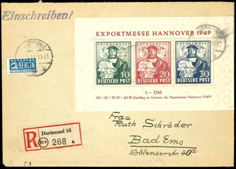 souvenir sheet issue "export fair Hanover 1948" as properly franked single franking with 2 pfennigs help for the Needy on registered letter from Dortmund to Bad Ems with arrival postmark on the back, photo expertize Hans Georg Schlegel BPP (Bl.1a) (page)