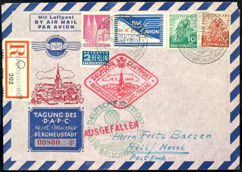 airmail registered mail franked with buildings number 90, number 106, number 107 as well help for the Needy surtax stamp and airmail stamp with additional imprint DAP on air mail envelope the Conference of the DAPC in Mountain new city from 15.5.1949. letter with corresponding airmail respectively b