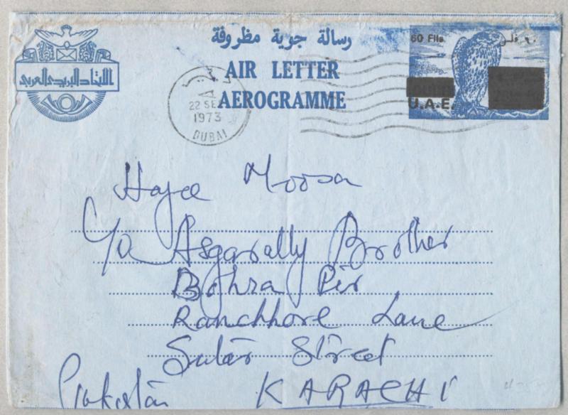 1973, 60 Fils Air Letter Aerogramme from DUBAI to KARACHI-2/Pakistan, tied with machine cancel 22 SEP 1973 DUBAI, arrival cancel KARACHI GPO 25 SEP 1973 PAKISTAN, fresh and interesting, XF! Estimate 200€.