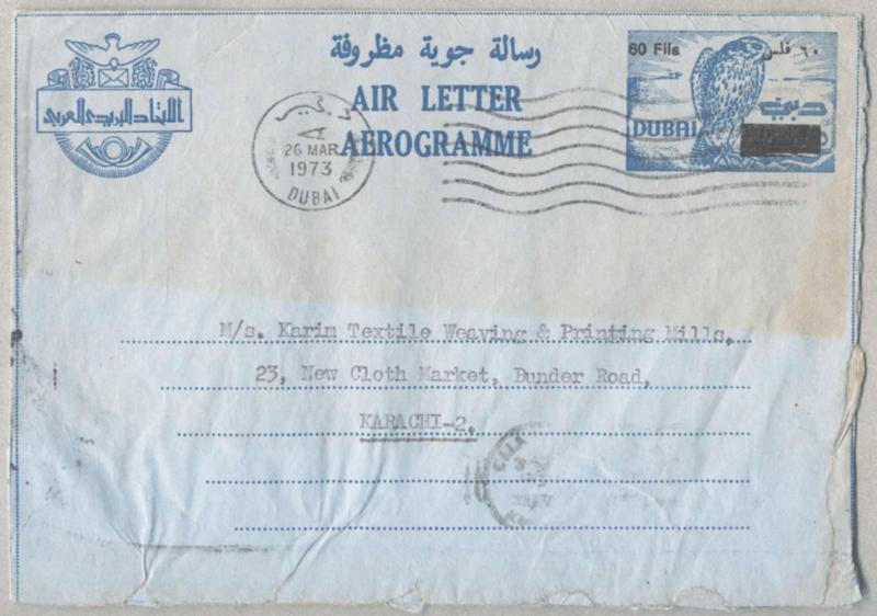 1973, 60 Fils Air Letter Aerogramme from DUBAI to KARACHI-2/Pakistan, tied with machine cancel 26 MAR 1973 DUBAI, arrival cancel KARACHI 28 MAR 1973 CITY DLY P.O., fresh and interesting, XF! Estimate 200€.