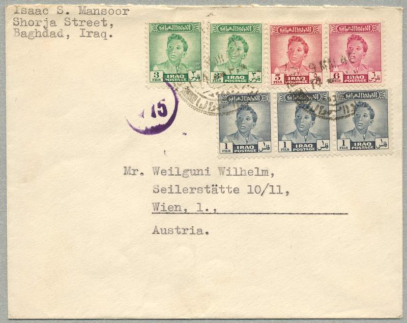 1948, 20 fils on censorship letter from BAGHDAD to WIEN, passed by censor, cancelled BAGHDAD and lilac V13 and 265 on front, BAGHDAD dispatch on reverse, excellent condition, VF-XF! Estimate 300€.
