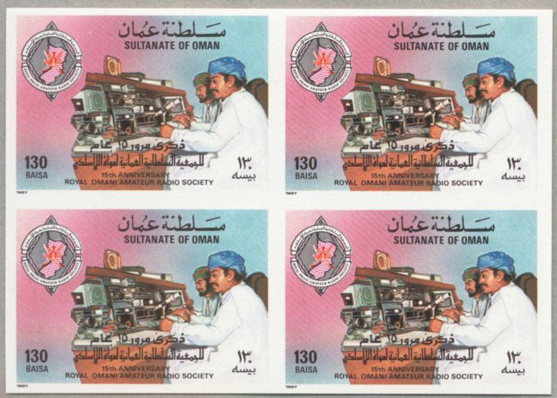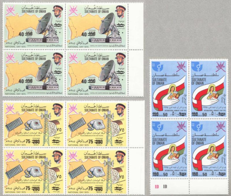 1978, July 30, Provisionals, National Day/40 b on 150 b, Year of the Women/50 b on 150 b and National Day/75 b on 250 b, blocks of (4) with left margins, LPOG never hinged, the rarest set of Oman, exceptional fresh and desirable, for the advanced Oman collector, CV £11400, SUP! Schätzpreis 13.680€.