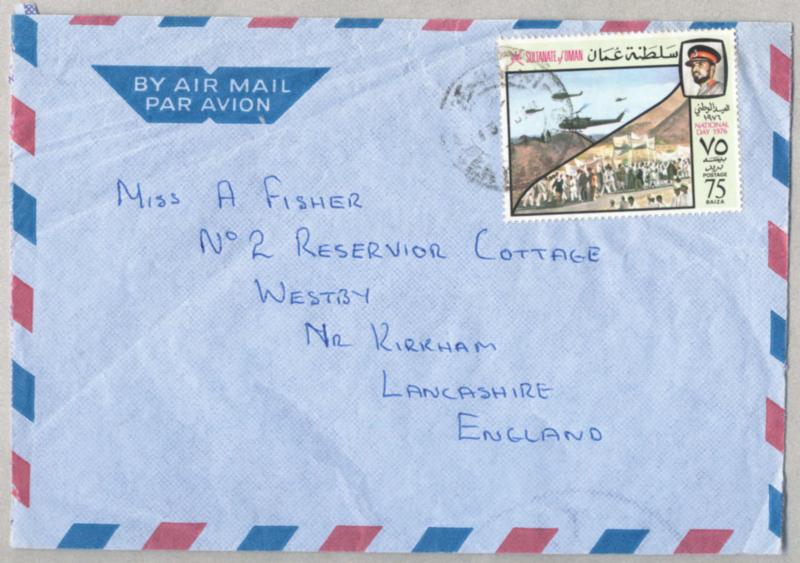 1977, 75 b., on Air Mail cover from Oman to KIRKHAM/England, tied with unclear cds 19 JAN 77, a fresh letter in perfect condition, XF! Estimate 300€.