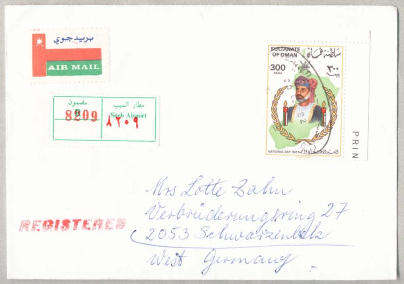 1981, 300 b., multicoloured, on registered Air Mail cover from SEEB AIRPORT/Oman to SCHWARZENBELZ/Germany, tied with light oval cancel 20 DEV 82 REGISTERED SEEB AIRPORT, red handstamp REGISTERED and AIR MAIL stamp, R label 8209, reverse with two same oval cancels, a fresh and desirable letter from a