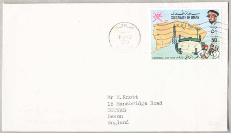 1978, 50 b., multicoloured, on letter from SALALAH/OMAN, to TOTNES/England, tied with machine cancel 1 JULI 1978 SALALAH, fresh and desirable letter in perfect condition, XF! Estimate 200€.