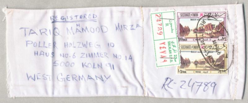 1980, 100 b. + 1/2 r., on registered letter made out of cloth from SALALAH/Oman to KÖLN/Germany, tied with oval 29 SEP 80 REGISTERED SALALAH on front and reverse, R Label and stamps are stapled, interesting curiosity, XF! Estimate 400€.