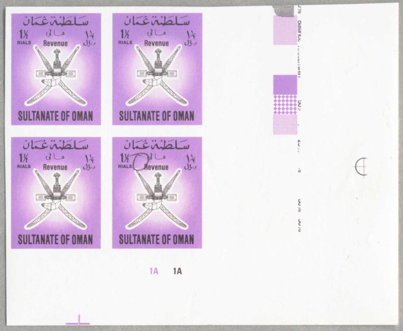 1972, 1 1/2 R., imperf. colour trial PROOF in LILAC instead of RED, block of (4) from top right corner with margins and printers marks, the printer circled a printing error on sheet, UNIQUE, Revenue, no wmk, LPOG never hinged, exceedingly fresh, XF! Estimate 600€.