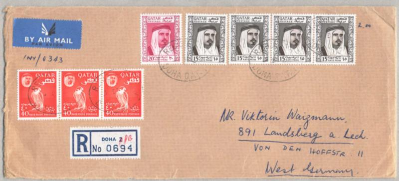 1961, 15 p., (4) + 20 p. + 40 p., (3), on triple rated, registered, Airmail letter from DOHA to LANDSBERG a. LECH/Germany, tied with oval REGISTERED DOHA QATAR cancels, on the reverse multiple DEPARTMENT OF POSTS PHILATELIC BUREAU violet addresses and oval cancel DOHA, an exceptional fresh letter in