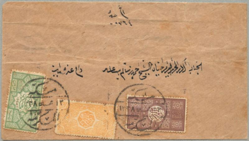 1917, from Mecca to Jeddah, cover franked with three different Hejaz-Nejd issues: 1 para green, 1/8 piastre orange, and 1/4 piastre brown, all with intricate Arabic calligraphy design, cancelled with bilingual double-circle MECCA postmark in Arabic script, clear arrival postmark JEDDA on reverse sid