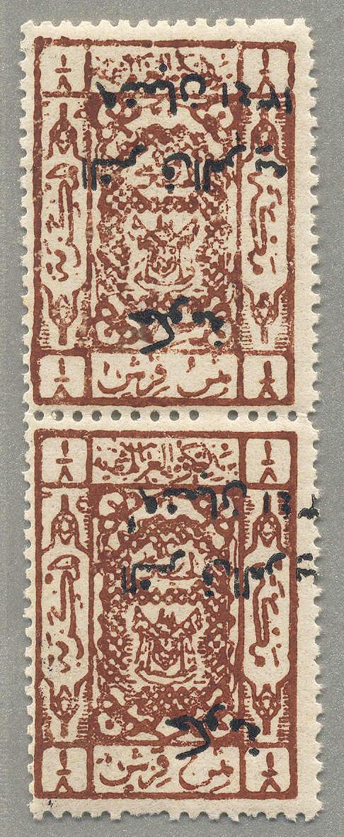 1924, 1/2 p., chestnut, pair, black OPT INVERTED on both stamps, top stamp MNH, bottom stamp MH, fresh unit, VF! Estimate 400€.